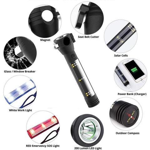 هذا المصباح متعدد الوظائف LED وأداة البقاء على قيد الحياة في حالات الطوارئ سيكون الأداة الأكثر فعالية. مصباحك الخاص هو مصباح يدوي متعدد الوظائف مع مطرقة ، قطع الحزام ، المغناطيس ، والبوصلة ، وبنك الطاقة. يمكن استخدامه كمصباح يدوي يدوي قياسي 3 وضعية لومن 200 ، و 10 ضوء LED عمل أبيض ساطع ، أو ضوء sos أحمر للطوارئ. يحتوي الطرف الفريد من نوعه على حزام قاطع ومطرقة (لكسر الزجاج في حالة الطوارئ) ومغناطيس لالتقاط مصباح يدوي. لوحة الطاقة الشمسية تسمح لك بالحصول على الطاقة الخاصة بك في بطارية 2000mah 18650. هذا المصباح أيضا يضاعف كبنك قوة لشحن أجهزة USB الخاص بك. هذا هو العنصر المثالي للحفاظ على ظهره ، المنزل ، حقيبة الظهر ، حقيبة bugout ، أو إلى حد كبير في أي مكان.